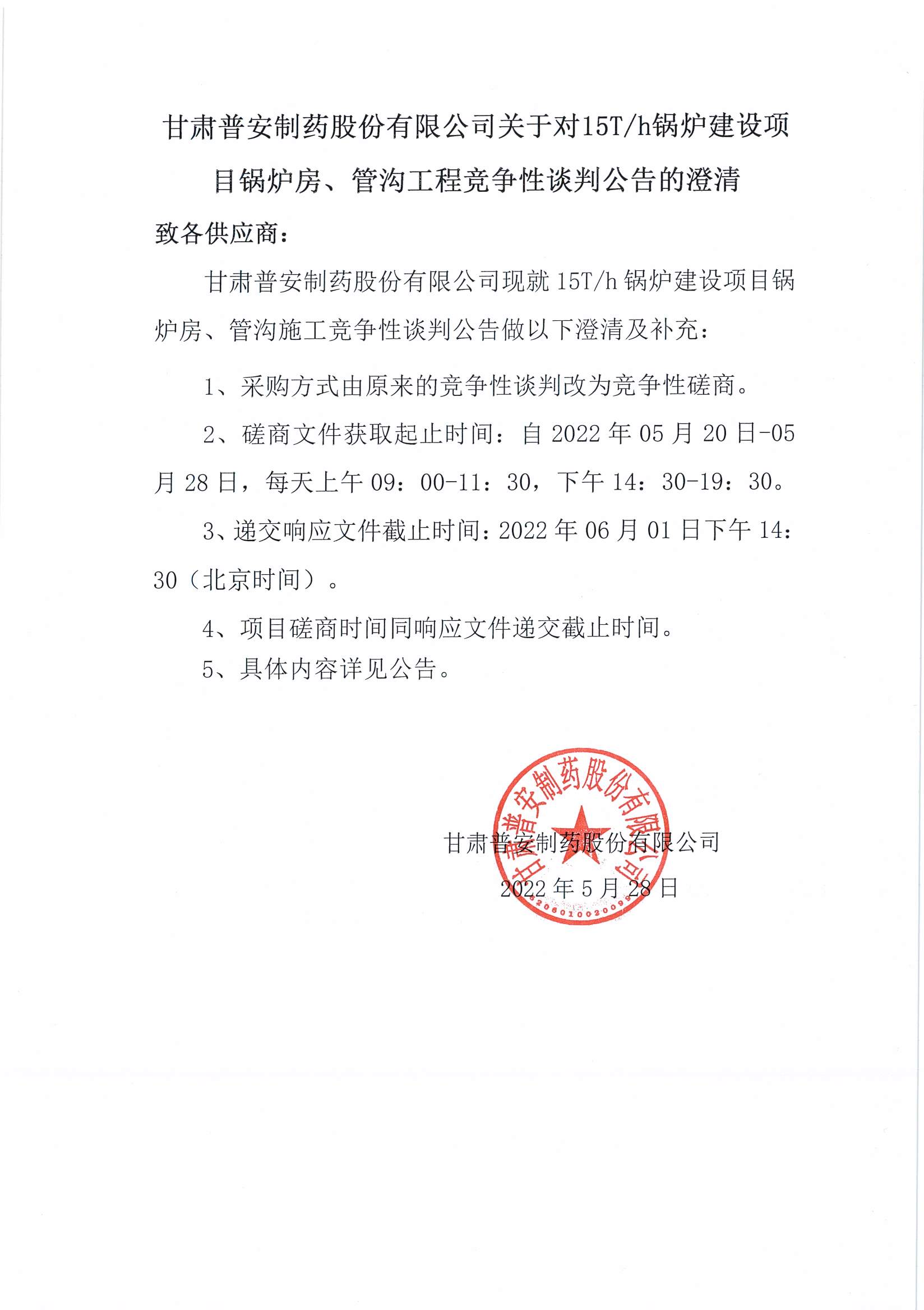 甘肅普安制藥股份有限公司關于對15T/h鍋爐建設項目鍋爐房、管溝工程競爭性談判公告的澄清