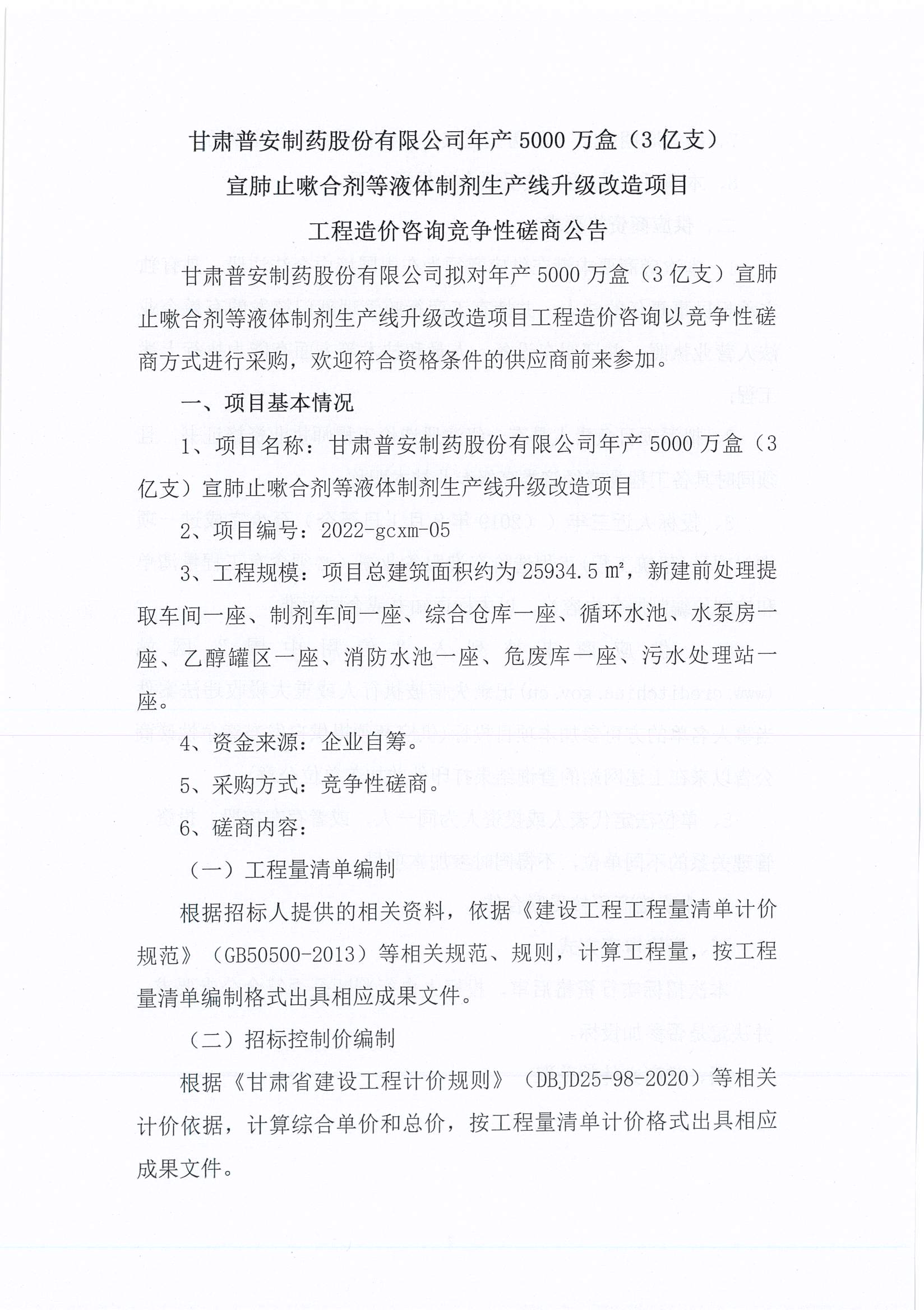 甘肅普安制藥股份有限公司年產5000萬盒(3億支)宣肺止嗽合劑等液體制劑生產線升級改造項目工程造價咨詢競爭性磋商公告