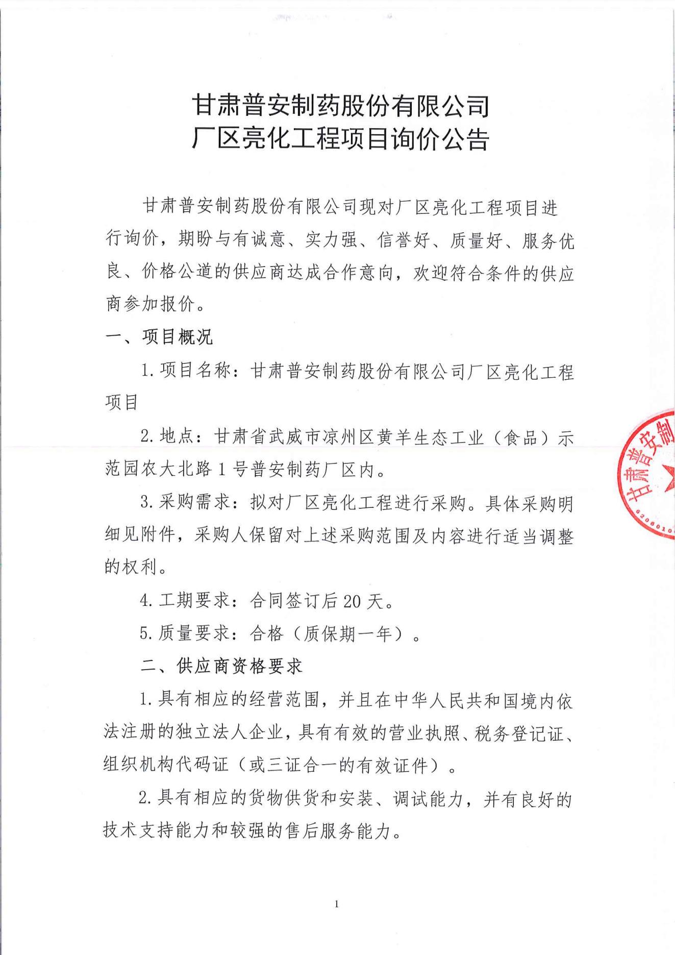 甘肅普安制藥股份有限公司廠區亮化工程項目詢價公告