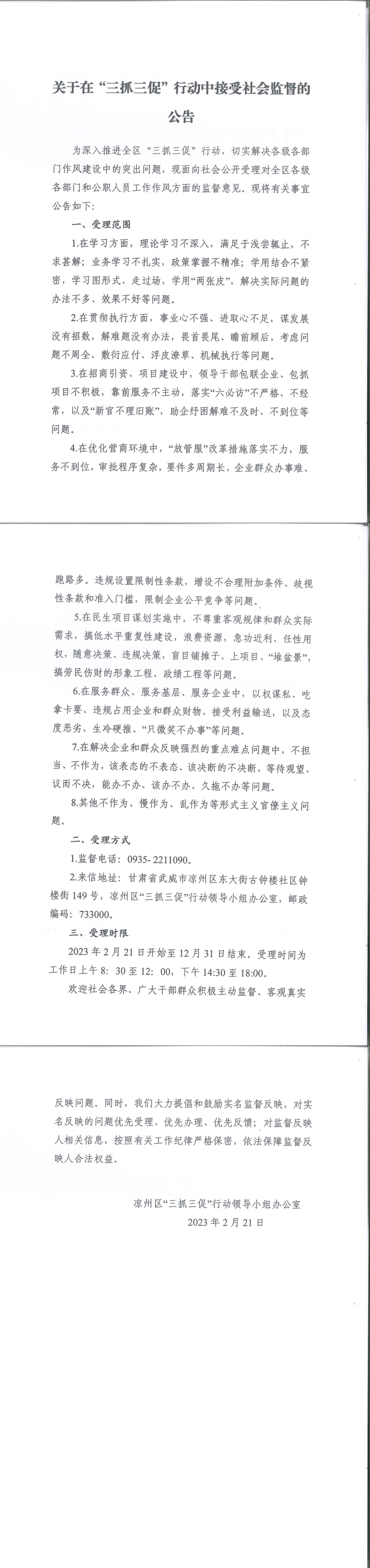 關于在“三抓三促”行動中接受社會監督的公告