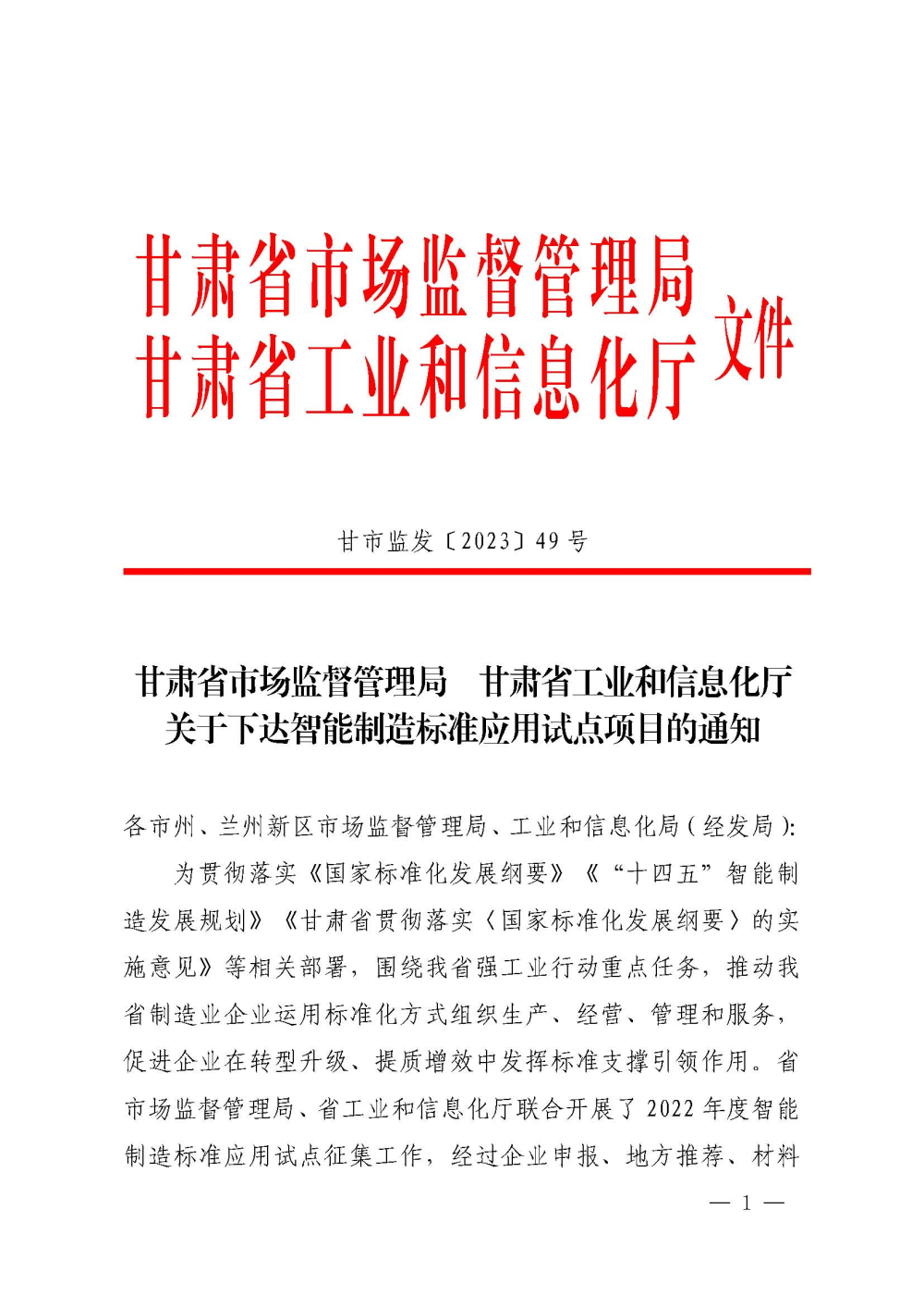 近日,甘肅省市場監(jiān)督管理局、甘肅省工業(yè)和信息化廳公布了省級智能制造標準應用試點項目名單。