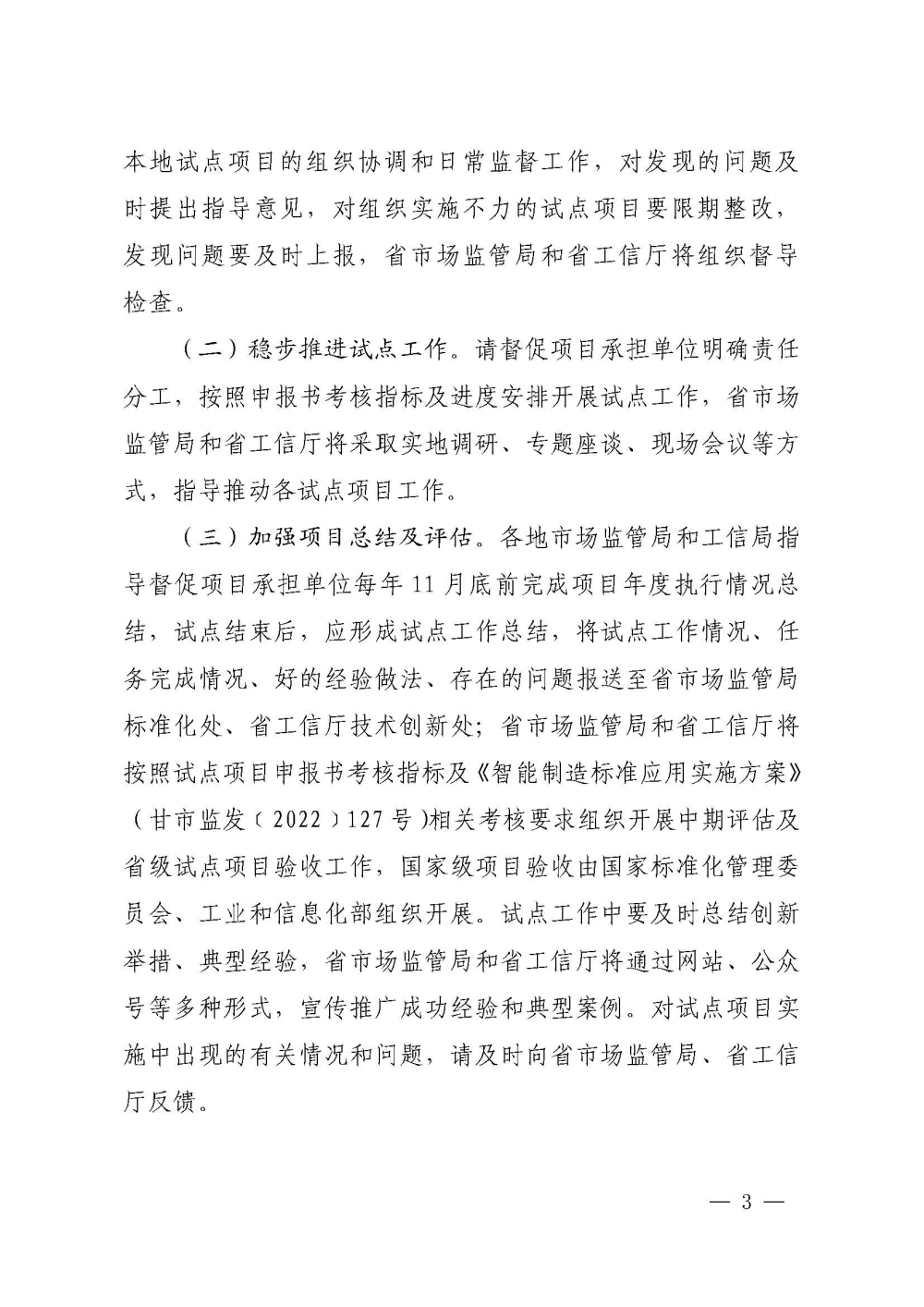 省級智能制造標準應用試點項目建設(shè)是為貫徹落實《國家標準化發(fā)展綱要》《“十四五”智能制造發(fā)展規(guī)劃》《甘肅省貫徹落實〈國家標準化發(fā)展綱要〉的實施意見》等相關(guān)部署,圍繞我省強工業(yè)行動重點任務,推動我省制造業(yè)企業(yè)運用標準化方式組織生產(chǎn)、經(jīng)營、管理和服務,促進企業(yè)在轉(zhuǎn)型升級、提質(zhì)增效中發(fā)揮標準支撐引領(lǐng)作用。