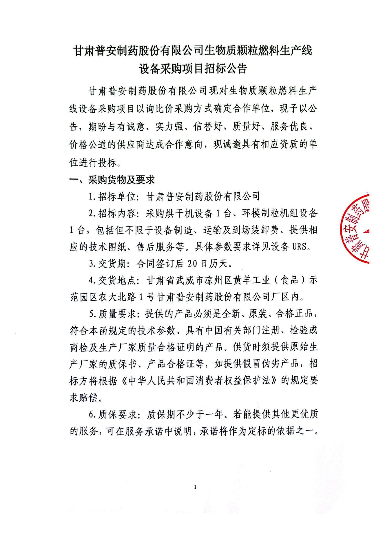 甘肅普安制藥股份有限公司生物質顆粒燃料生產線設備采購項目
