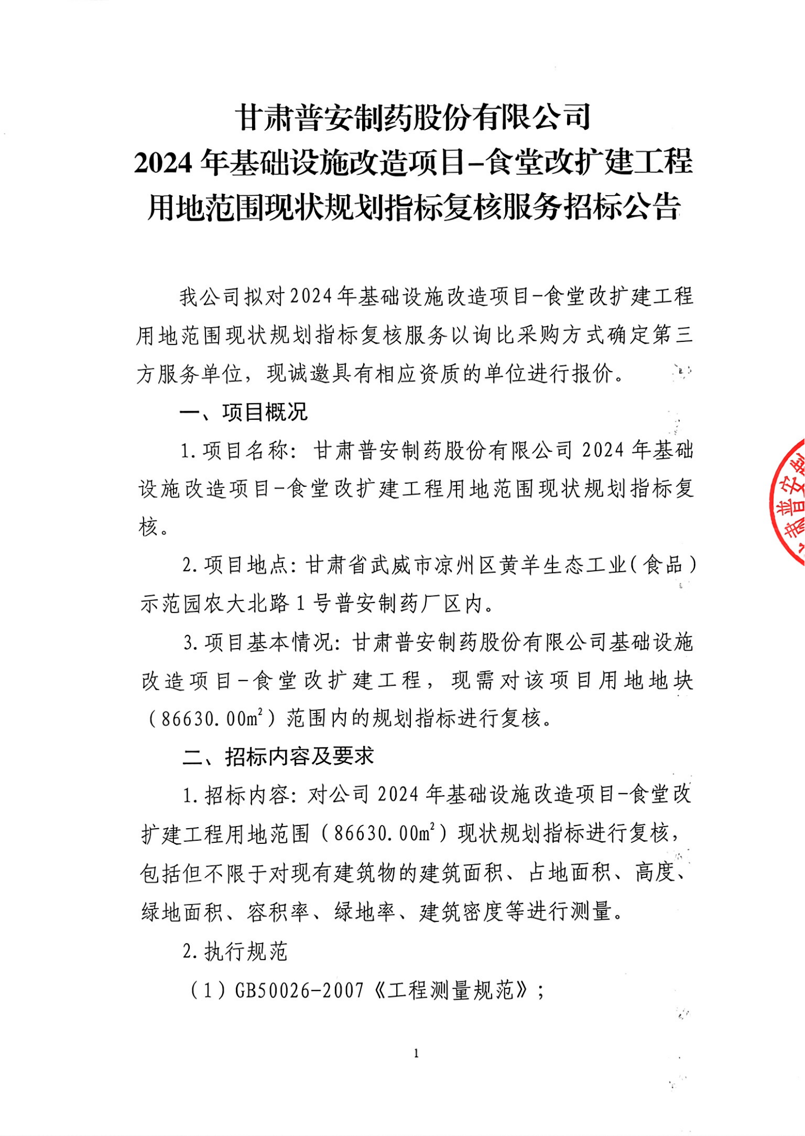甘肅普安制藥股份有限公司2024年基礎(chǔ)設(shè)施改造項(xiàng)目-食堂改擴(kuò)建工程用地范圍現(xiàn)狀規(guī)劃指標(biāo)復(fù)核服務(wù)招標(biāo)公告