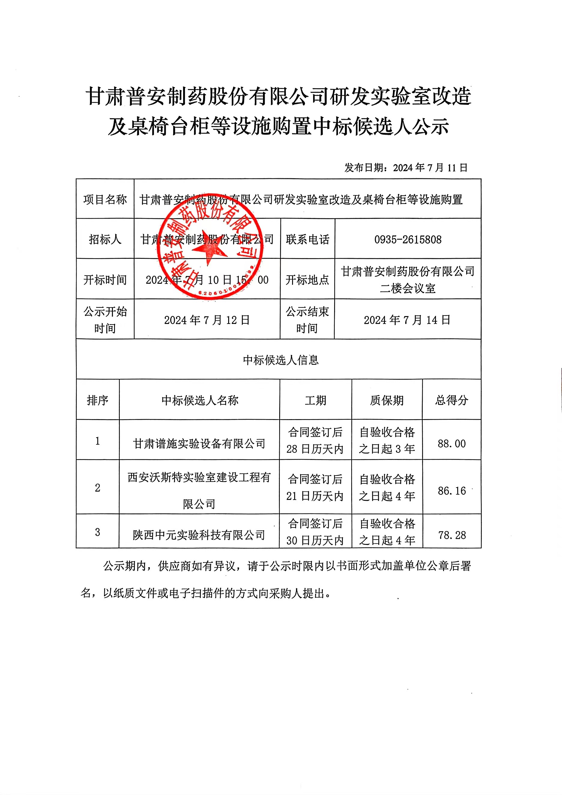 甘肅普安制藥股份有限公司研發(fā)實驗室改造及桌椅臺柜等設(shè)施購置中標候選人公示